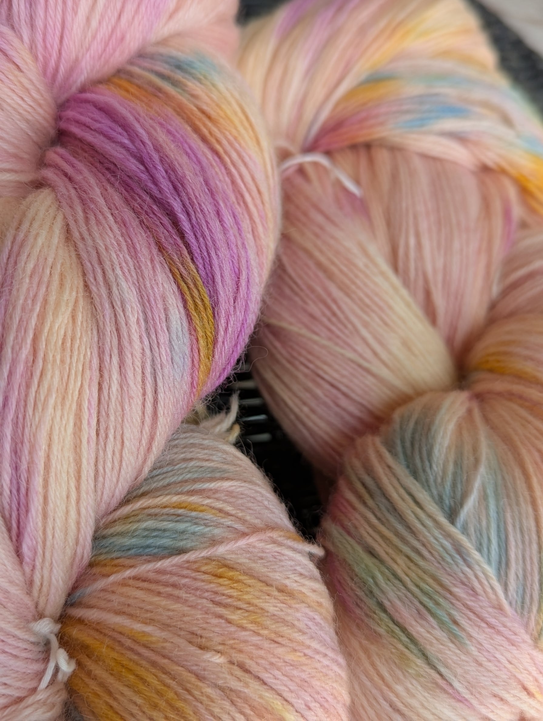 ひとつずつ手染めした段染め一点モノの毛糸です。糸はランダムに色を入れていますが、イメージは最後の写真を参考にしてください。