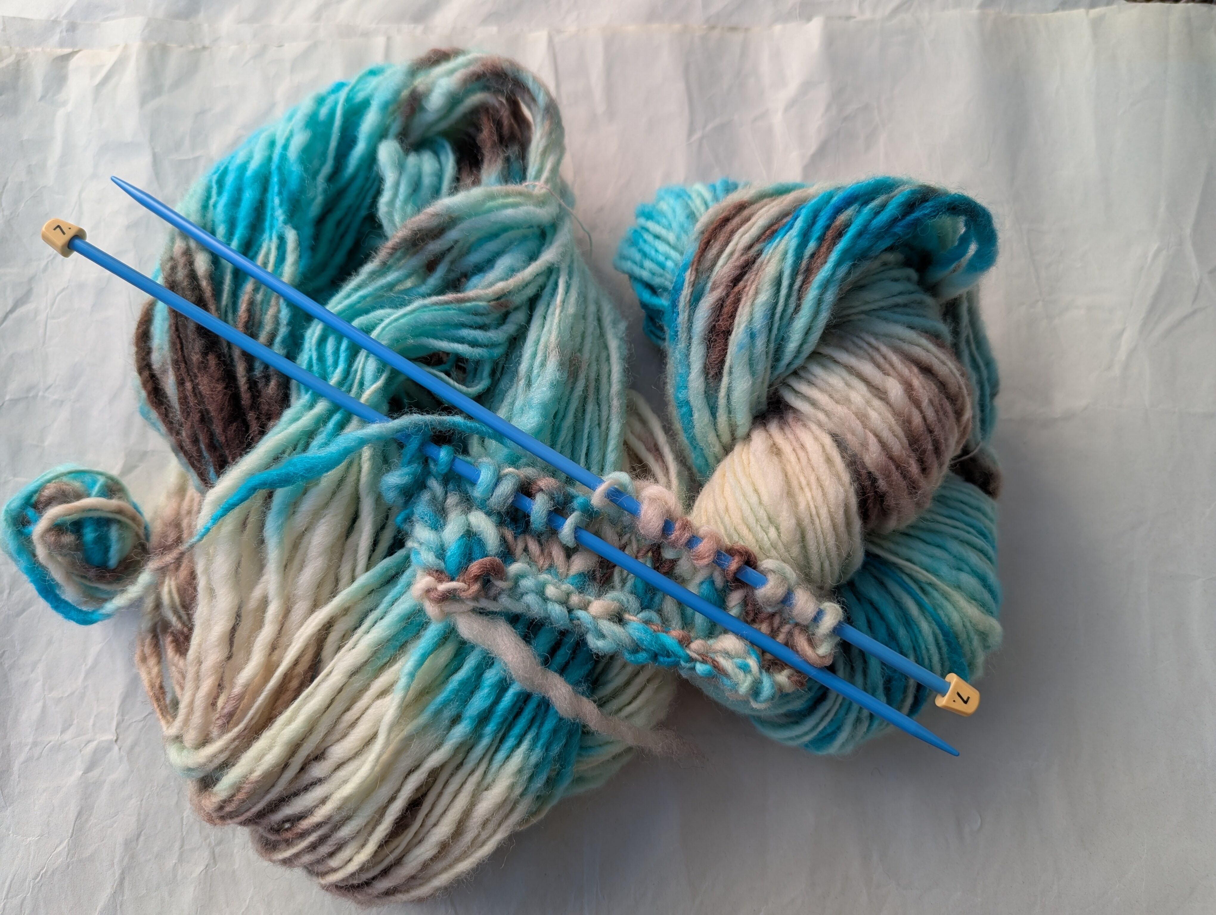 ■ 手染めならではの色合い。厳選した素材から作られた糸です。約1m/g の長さがあり、写真の見本編みは7号針で緩めに編んでいます。。
