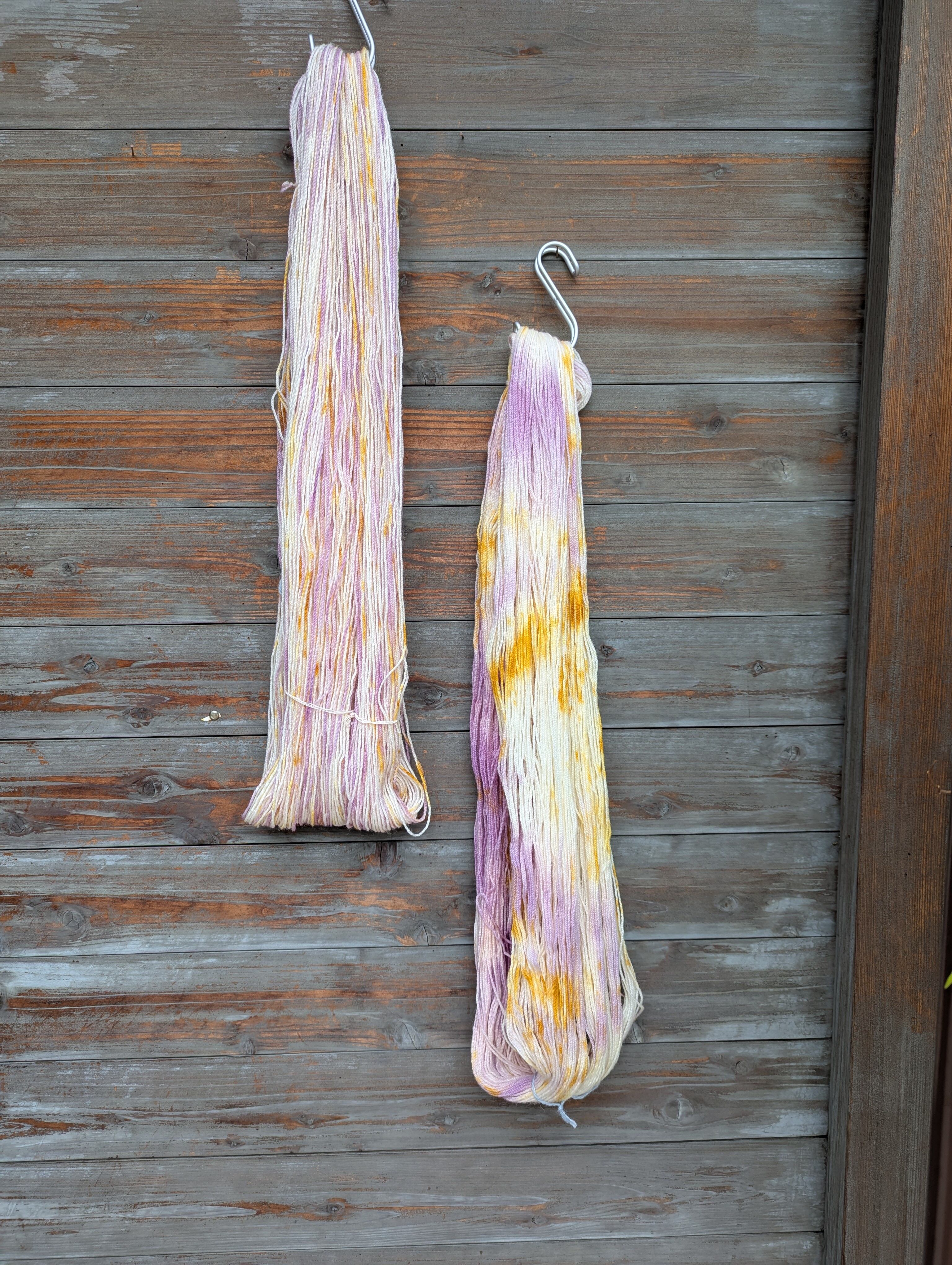 ひとつずつ手染めした段染め一点モノの毛糸です。糸はランダムに色を入れていますが、イメージは最後の写真を参考にしてください。