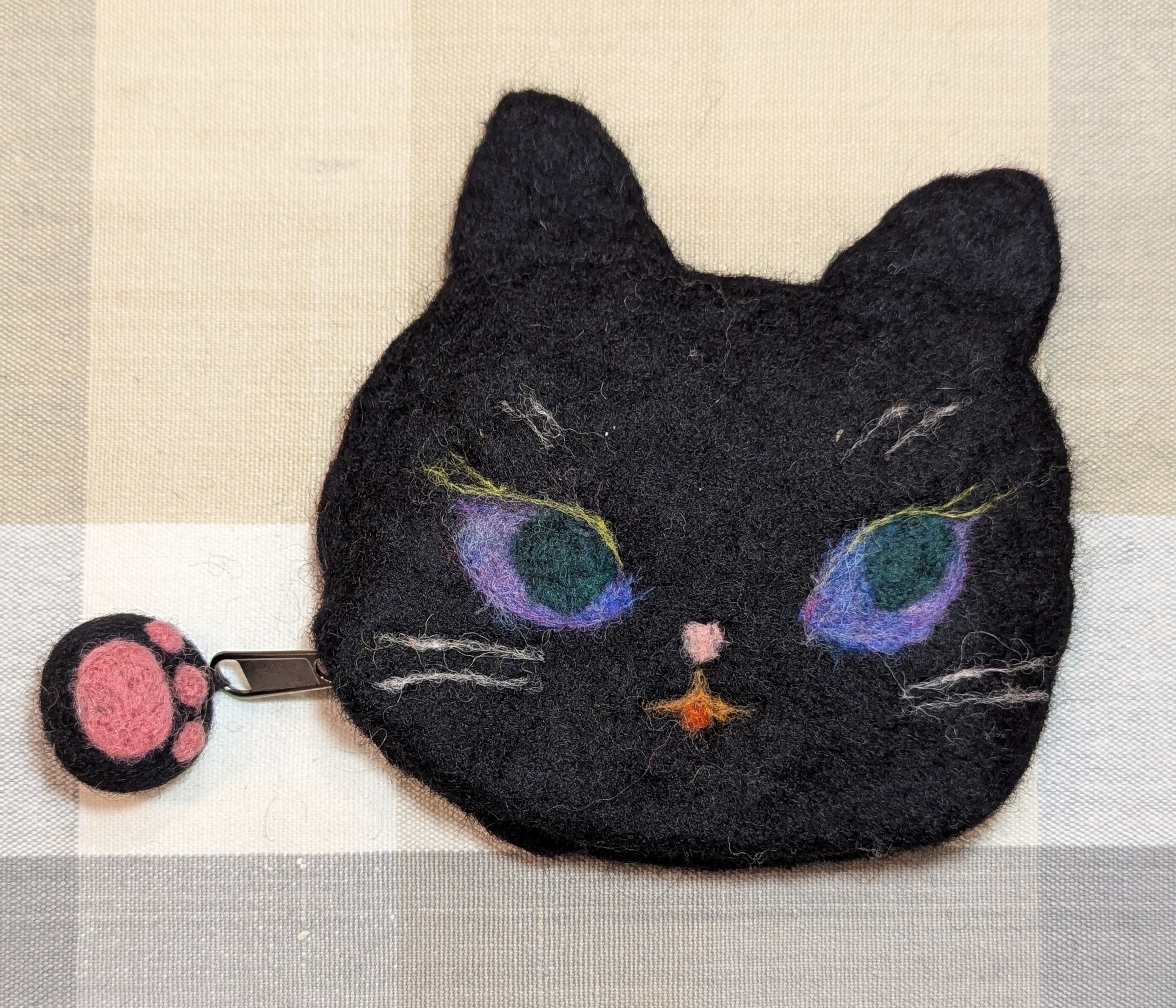 ネパールで1つずつ丁寧に作られたハンドメイドポーチに くろねこ羊毛部にてお顔の表情をニードルフェルトで刺しました。