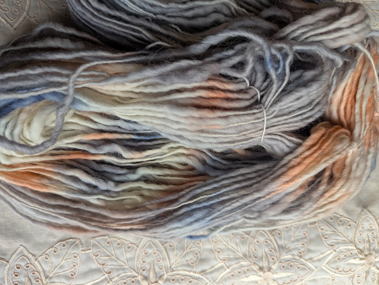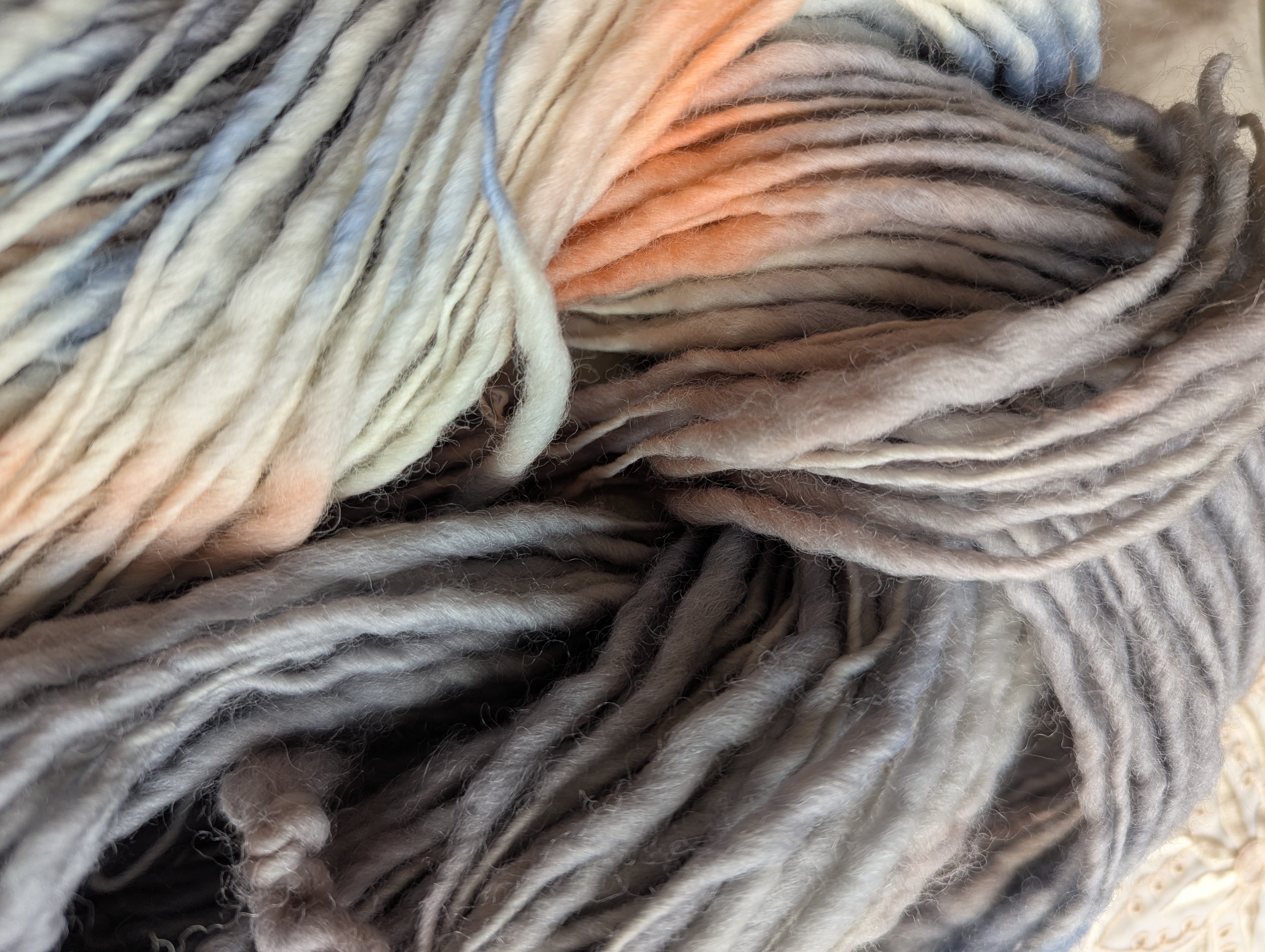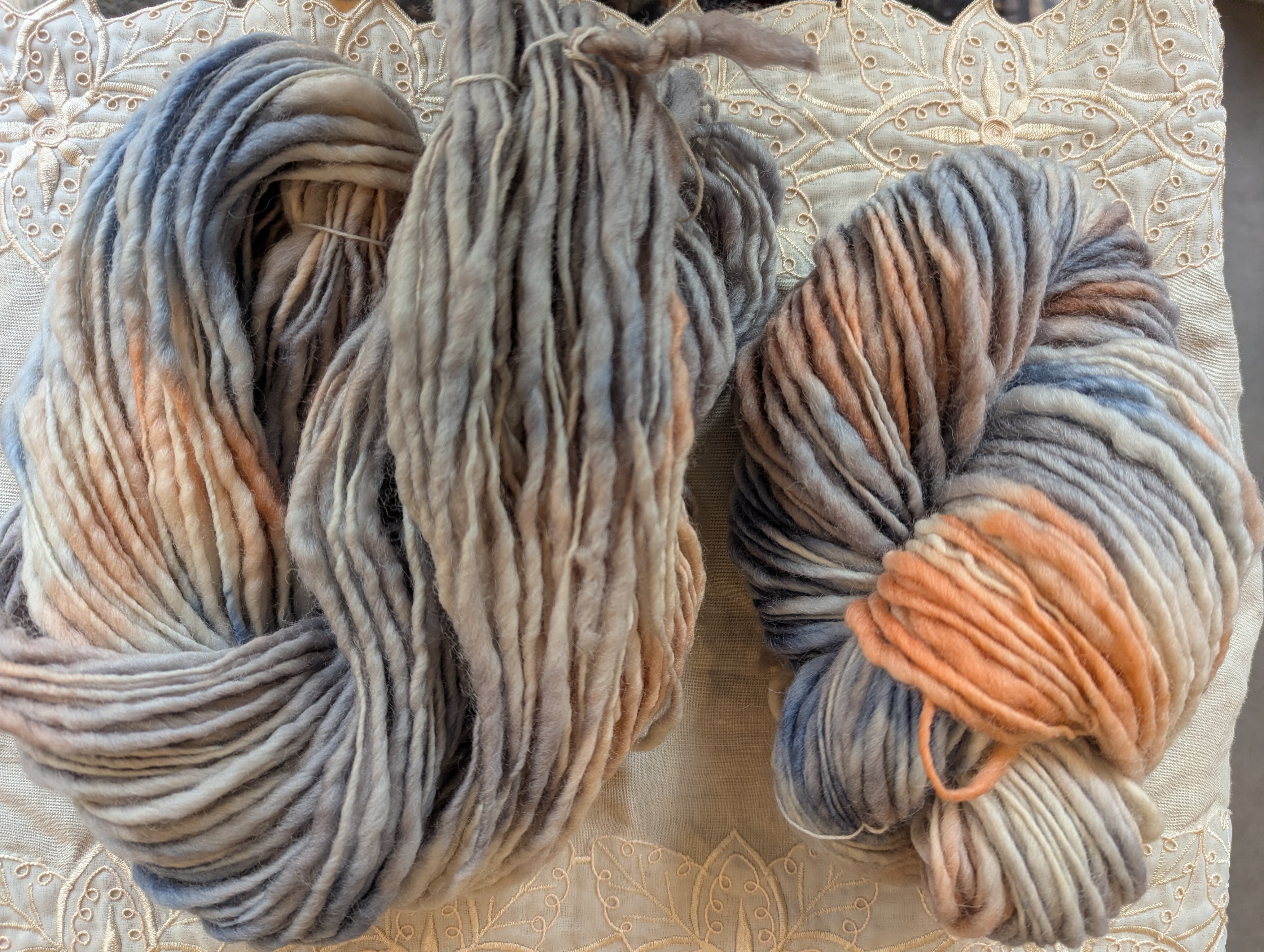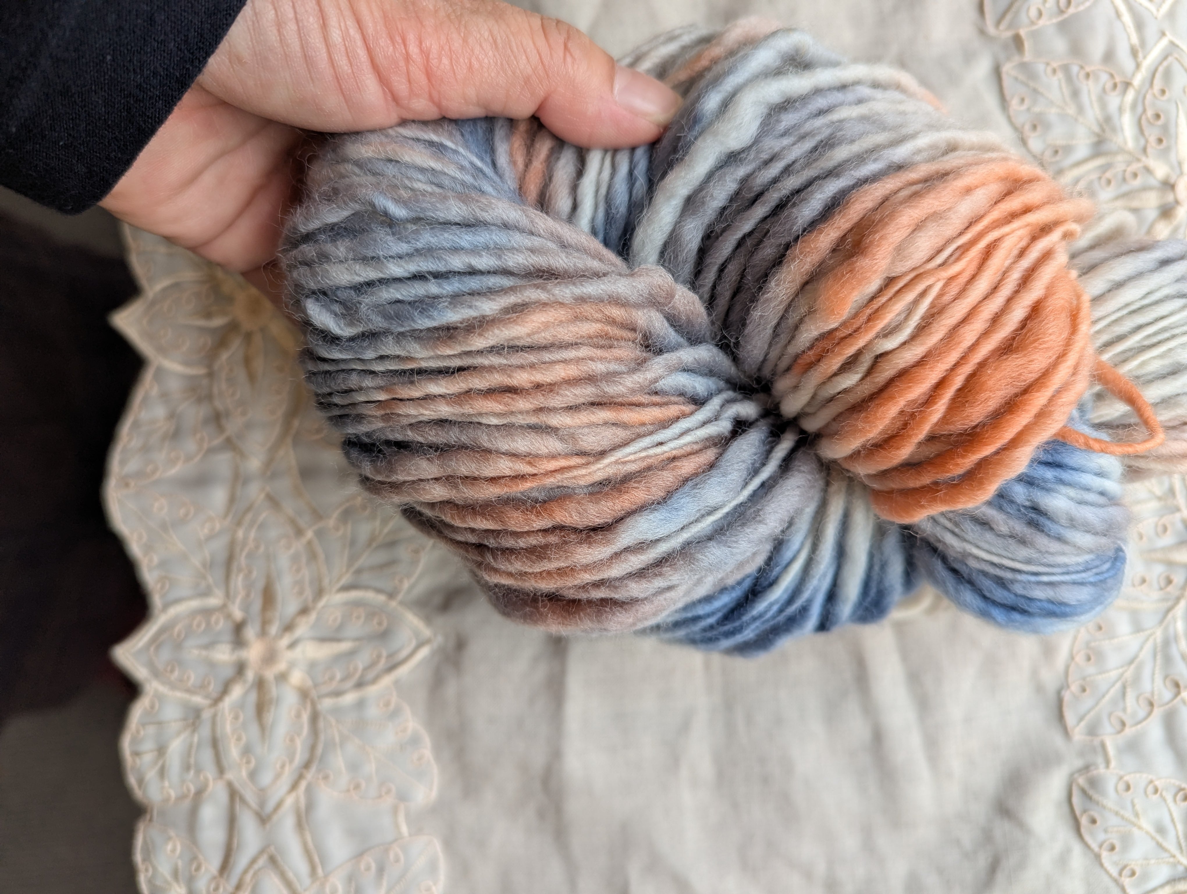 ■ 手染めならではの色合い。厳選した素材から作られた糸です。約1m/g の長さがあり、写真の見本編みは7号針で緩めに編んでいます。。