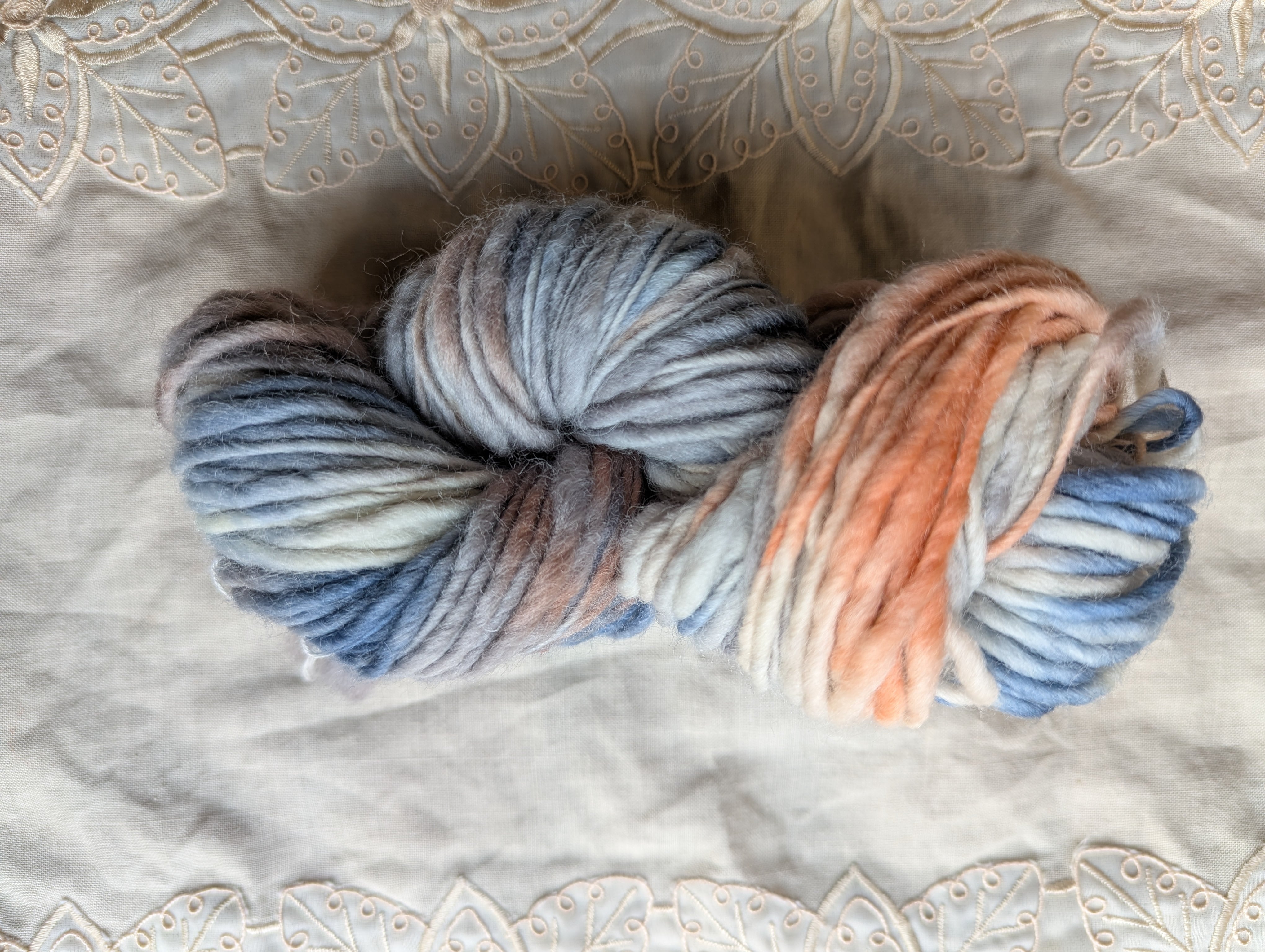 ひとつずつ手染めした段染め一点モノの毛糸です。糸はランダムに色を入れていますが、イメージは写真を参考にしてください。