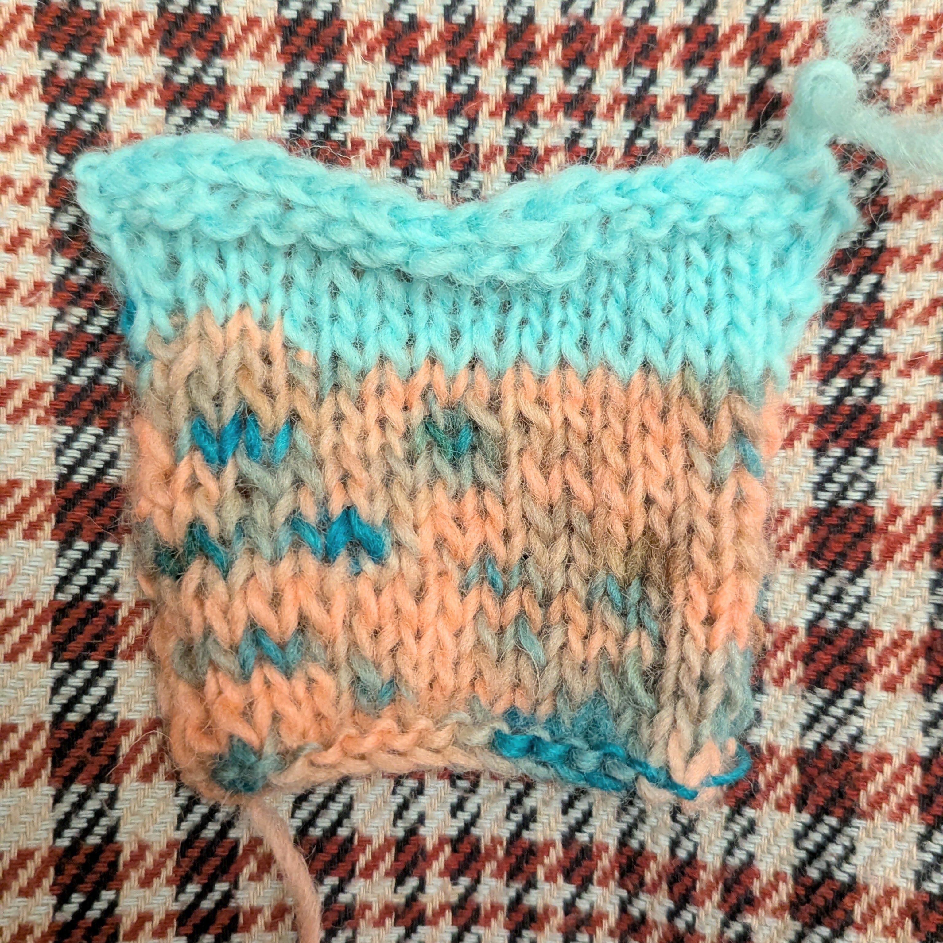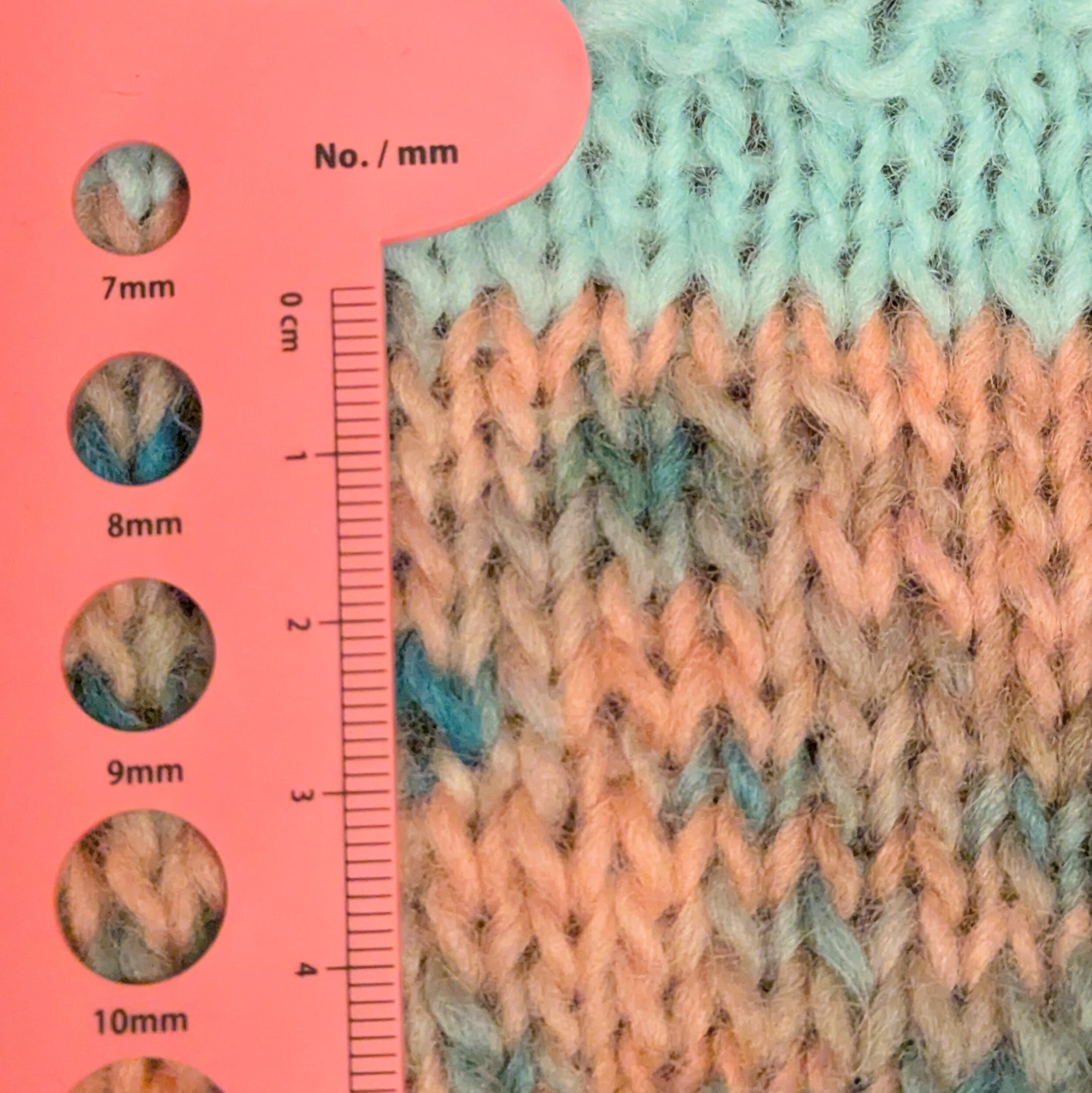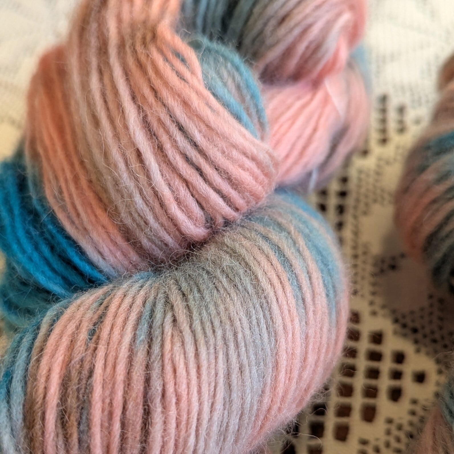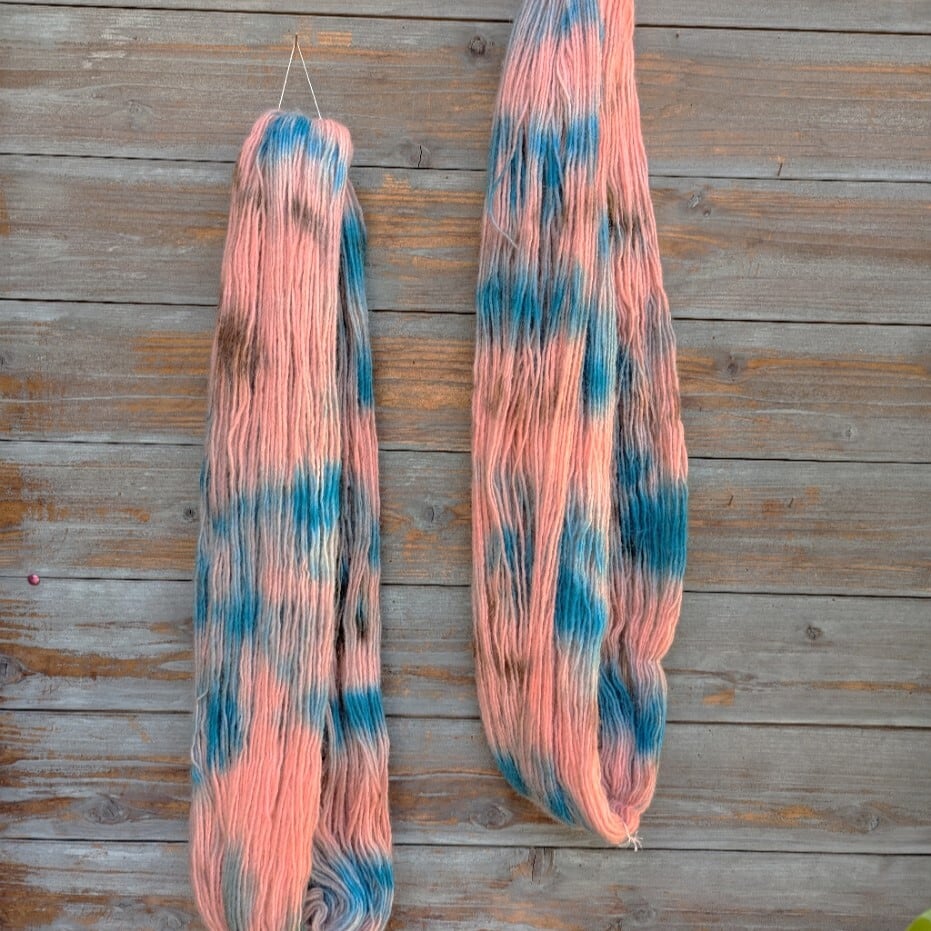 ■ 手染めならではの色合い。厳選した素材から作られた糸です。約1m/g の長さがあり、写真の見本編みは7号針で緩めに編んでいます。。