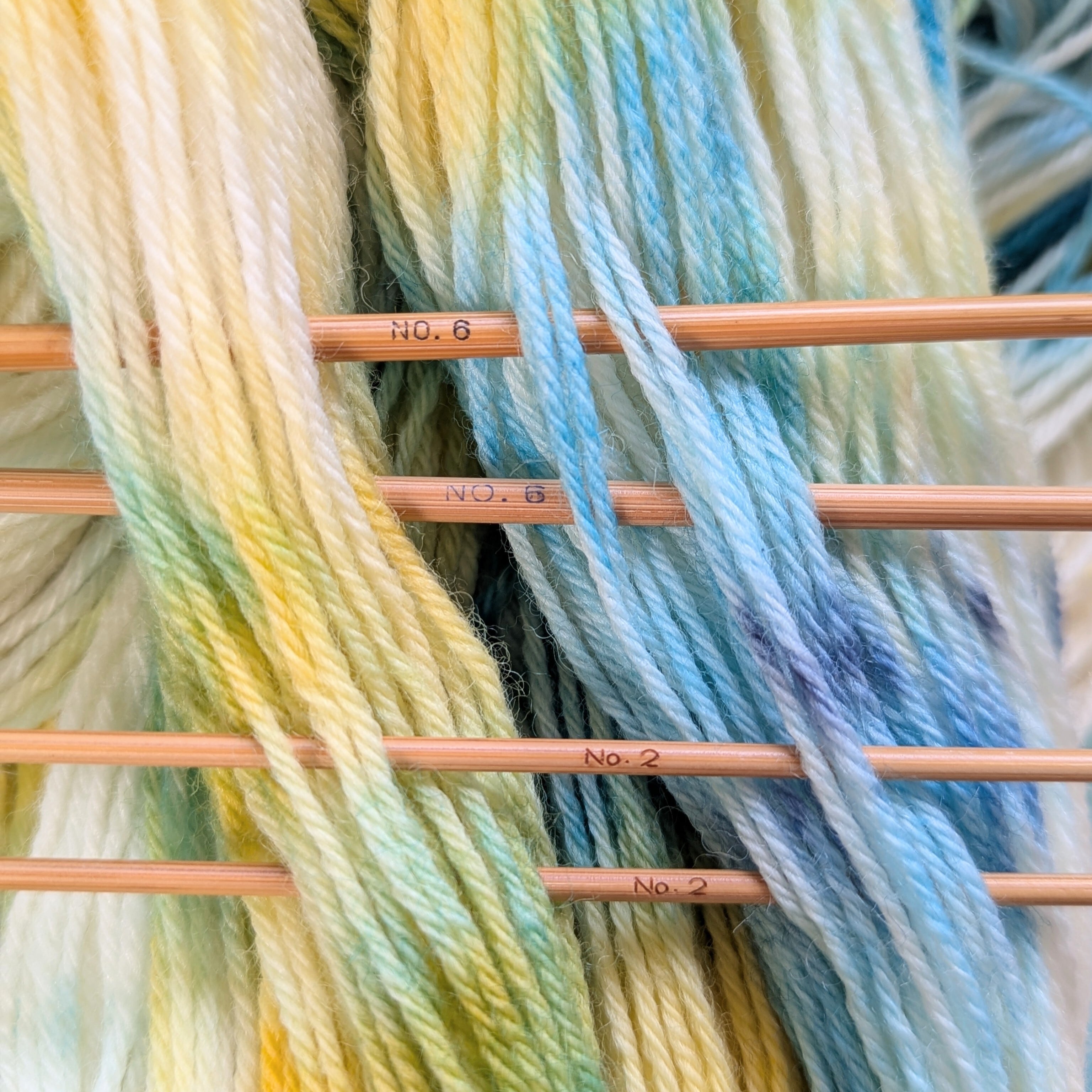 4枚目の写真は編み棒日本サイズ6号、2号を並べています。ご参考にして下さい。